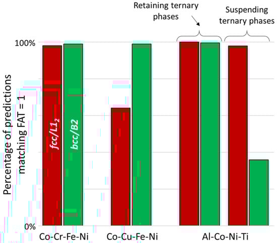 Percentage of predictions matching FAT = 1 for the Co-Cr-Fe-Ni and Co-Cu-Fe-Ni quaternary systems, for the fcc/L12 and bcc/B2 phase points, respectively, when neglecting ternary interactions (FAT = 0). For the Al-Co-Ni-Ti system, the first condition corresponds to a special case of FAT = 0, when all ternary interactions are canceled but the ternary phases are artificially retained, while the second condition corresponds to the actual FAT = 0 condition, when both ternary interactions and ternary phases are suspended.