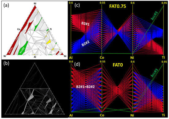 The discrepancies between predictions performed based on ternary descriptions and those without are even more severe for the Al-Co-Ni-Ti system (Figure 5). In addition to the disordered fcc and bcc solid solutions, this system also contains several ordered (L12, B2) binary intermetallic (Al5Co2, Al3Co, Al13Co4, Al9Co2, Al3Ni, Al3Ni2, BCT, Al2Ti, AlTi, AlTi3, Ni3Ti, (Co,Ni)Ti2, Laves-C15 and Laves-C16) and several ternary intermetallic (H_L21, Laves_C14) phases (Figure 5a). The presence of many different phase field regions in this quaternary system results in high density of boundaries between these regions, where the main disagreements between FAT = 0 and FAT = 1 calculations occur. In addition, FAT = 0 calculations cannot predict composition regions for ternary intermetallic phases. Instead, they fill these regions with available binary phases (mainly the bcc and B2 phases). This can be well visualized by comparing the bcc and B2 phase points represented in parallel coordinate plots for FAT = 3/4 (Figure 5c) to FAB = 0 (Figure 5d).