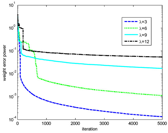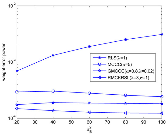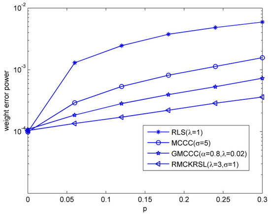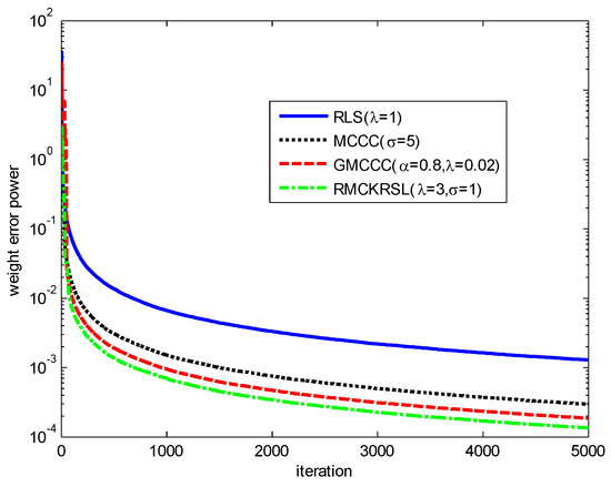 First, we verify the superiority of the RMCKRSL in the presence of contaminated Gaussian noise [17,19], i.e., , where , with , with represents an outlier (or impulsive disturbances), is the occurrence probability of impulsive disturbances, . To ensure a fair comparison, all the algorithms use the recursive iteration to search the optimal solution. The parameters for different algorithms are chosen experimentally to guarantee the desirable solution. The performances of different algorithms on the basis of weight error power are shown in Figure 1. It is clear that compared with the MCCC, GMCCC and traditional RLS, RMCKRSL has the best filtering performance.