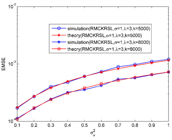 Then, the validity of the theoretical EMSEs for MCKRSL is demonstrated. The noise model is also a contaminated Gaussian model, where , , and . Figure 2 compares the values of the theoretical EMSEs and simulated ones under variations of . Obviously there is a good match between the theoretical EMSEs and the simulated ones. In addition, it has been shown that the value of EMSE becomes bigger with the increase of noise variance.