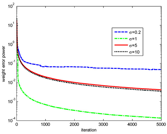 Finally, the influences of the kernel width and risk-sensitive parameter on the performance of the RMCKRSL are investigated. The noise model is also a contaminated Gaussian noise, where , , and . Figure 5 and Figure 6 present the performance of the RMCKRSL under a different kernel width and risk-sensitive parameter , respectively. One can see that both the kernel width and risk-sensitive parameter play an important role in the performance of the RMCKRSL. It is challenging to choose the optimal and because it is dependent on the statistical characteristic of the noise, which is unknown in the practical case. Thus, it is suggested that the parameters are chosen by experimentation.