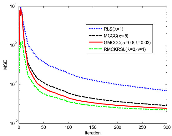 is the reverse of , and is a complex valued number whose real and imaginary parts are randomly generated and obey a uniform distribution over the interval [0, 1]. is discretized by sampling with an interval of six seconds, and affected by the contaminated Gaussian noise , where , with , with , , . is predicted by x(k) = [s(k − 1) s(k − 2) ⋯ s(k − 6)] and the performance is measured by the mean square error (MSE) with . The convergence curves of different algorithms on the basis of MSE are compared in Figure 7. One may observe that the RMCKRSL has a faster convergence rate and better filter accuracy than other algorithms. In addition, the RLS behaves the worst since the minimum square error criterion is not robust to the impulse noise.