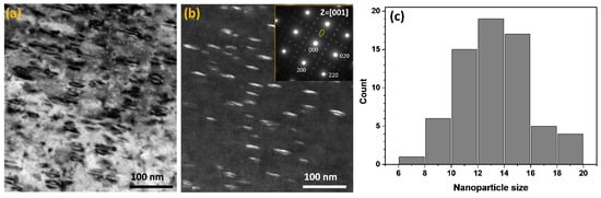 The BF-TEM (a); and the DF-TEM (b) images of the sample aged for 40 h. The inset in (b) is the SADP along the zone-axis z = [001]. (c) The size distribution of the γ″ nanoparticles.