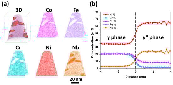 Figure 2 shows the APT results of the sample aged for 40 h. In the three-dimensional (3D) atom map, the γ″ nanoparticles are delineated by 50 at.% Ni iso-concentration surfaces in red. It can be observed that the γ″ nanoparticles are disk-like. From the sliced atom maps, it can be found that the γ″ nanoparticles mainly consist of Ni and Nb. In addition, Co element shows a strong tendency to partition into the γ″ nanoparticles, but Fe and Cr elements are largely depleted from the γ″ nanoparticles. To clarify the accurate composition of these γ″ nanoparticles, the proximity histogram, which is calculated over the iso-concentration surfaces, is plotted (Figure 2b). Therein, the chemical elements are displayed as a function of the distance from the iso-concentration surfaces. The proximity histogram shows that the average concentration of Co is up to 8.2 ± 0.3 at.%, but the average concentrations of Fe and Cr are only 1.3 ± 0.4 and 1.6 ± 0.1 at.% in the γ″ nanoparticles, respectively. To investigate the composition stability of γ″ nanoparticles, the sample aged for 100 h was also analyzed by APT. The composition of the γ″ nanoparticles are summarized in Table 1. It was found that the composition of γ″ nanoparticles in the sample aged for 100 h is almost the same as that in the sample aged for 40 h, which indicates that the composition of γ″ nanoparticles have reached the steady state after 40 h aging. The APT results demonstrate that the Co element is much easier to partition into the γ″ nanoparticles than Fe and Cr elements. In addition, Co, Fe, and Cr prefer Ni sublattice sites in the Ni3Nb-type γ″ nanoparticles because the Ni composition in the γ″ nanoparticles are only 65 at.%. It should be noted that a small part of Co, Fe, or Cr atoms may also occupy Nb sublattice sites as the Nb composition in the γ″ nanoparticles is about 24%. However, it is difficult to determine which kind of elements occupied Nb sublattice sites only from APT results. Some similar results are also found in the Ni-based superalloys [,,]. For example, Lawitzki et al. reported that the alloying elements such as Cr occupied both the Ni and Nb sublattice sites of γ″ phase in the 718 alloy [].