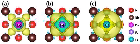 To further clarify the origin of the formation energy differences of Co, Fe, and Cr in the D022-structured Ni3Nb, the total energy, and the chemical potential of the solute atoms are carefully checked, as the formation energy is determined by these two parts. It is found that the formation energy difference between Fe and Cr is mainly caused by the difference of their chemical potentials because the total energies of and are almost the same. However, both the chemical potential and the total energy of Co () are higher than that of Fe and Cr, which indicates that the formation energy differences between Co and Fe/Cr not only result from their chemical potential differences, but also come from their total energy differences. As the total energy originates from the charge distribution of the system, we calculated the charge density difference of Ni23CoNb8, Ni23FeNb8, and Ni23CrNb8 systems with reference to Ni24Nb8 system, respectively. From the charge density difference, we can find that the charge accumulation appears between Co and Nb atoms (Figure 3a) but does not appear between Fe and Nb (Figure 3b), or Cr and Nb (Figure 3c). The charge distribution results indicate that the bonding for Co and Nb is much stronger than that of Fe and Cr. The strong Co-Nb bond stabilizes Co atoms in the D022-structured Ni3Nb, which demonstrates that the bonding state of Co plays an important role in lowering the formation energy compared with that of Fe and Cr.