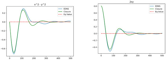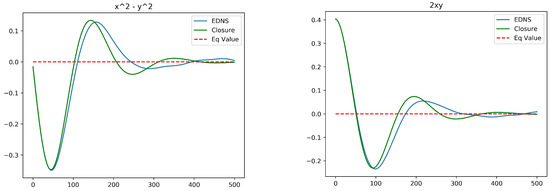 Taking a broader view, the main output of the optimal closure is the matrix , which controls the dissipative structure of the reduced equations. The stationary matrix plays the role of the transport matrix familiar from classical linear irreversible thermodynamics, in the sense that after the transcient stage it relates the thermodynamic “forces” to the thermodynamic “fluxes” [44]. From this perspective, the reduced model tested in this section may be regarded as one instantiation of a nonequilibrium thermodynamics of isolated coherent structures.