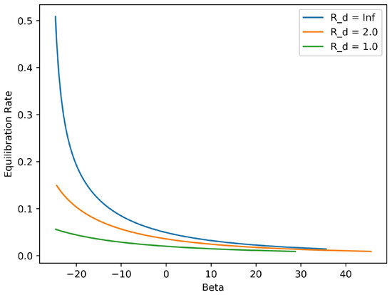 The dependences of the rate of equilibration on the inverse temperature and on the Rossby radius are displayed in Figure 4 and Figure 5, respectively. The rate plotted in both of these figures is the double eigenvalue of the matrix , the stationary limit of for large time t. That is a scalar matrix (diagonal with equal entries) is a consequence of a rotational symmetry in this reduced model: expressed in polar coordinates the two resolved variables satisfy, . This symmetry implies that the coefficient matrices in the Riccati Equation (32) are special: C and D are scalar, and J is antisymmetric. (We omit the elementary calculations needed to check these properties.) It follows that the solution of (32) is necessarily a scalar matrix.