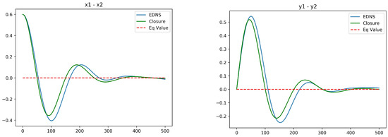 EDNS compared to optimal closure for two-layer quasi-geostrophic dynamics for . (left): ; (right): . The initial conditions are and .