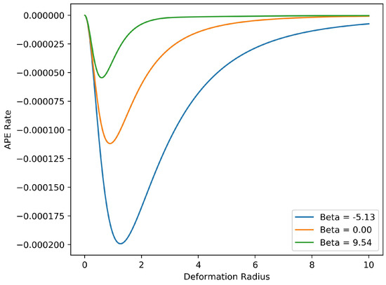 Figure 7 displays the dependence of the rate of energy transfer from potential to kinetic energy on the inverse temperature of the barotropic equilibrium state, and on the internal deformation radius . The available potential energy is expressible as a quadratic form in , namely,