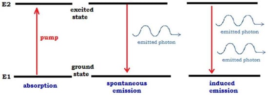 Thus, one photon produces two, these two interact with two atoms and produce four photons, after n-step, this process generates photons. We note that this description and its illustration by Figure 1, although typical for physics textbooks, is too straightforward. In fact, an atom interacts not with a single photon, but with all photons in the field (see Section 5 and Equation (10)).