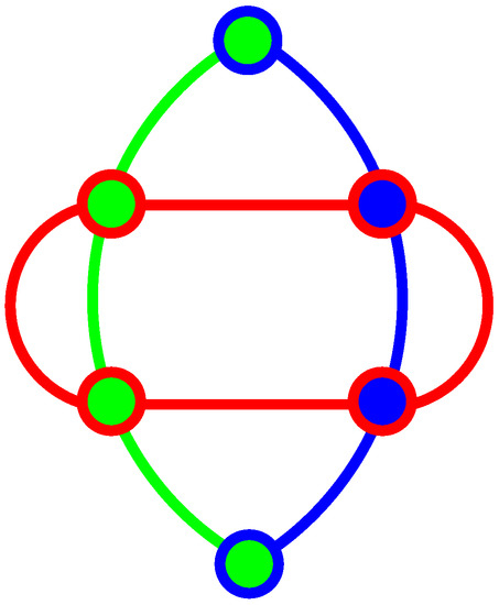 In Figure 1, we show the smallest possible 4D KS MMP hypergraph with six vertices and three edges. We can easily verify that it is impossible to assign 1 and 0 to its vertices so as to satisfy the conditions () and () from Theorem 1. For instance, if we assign 1 to the top green-blue vertex, then, according to the condition (), all of the other vertices contained in the blue and green edges must be assigned value 0, but, herewith, all four vertices in the red edge are assigned 0s in violation of the condition (), or, if we assign 1 to the top red-blue vertex, then, according to the condition (), all the other vertices contained in the blue and red edges must be assigned value 0, but, herewith, all four vertices in the green edge are assigned 0s in violation of the condition (). Analogous verifications go through for the remaining four vertices. We verified that there is neither a real nor complex vector solution of a corresponding system of nonlinear equations [38]. We have not tried quaternions as of yet.