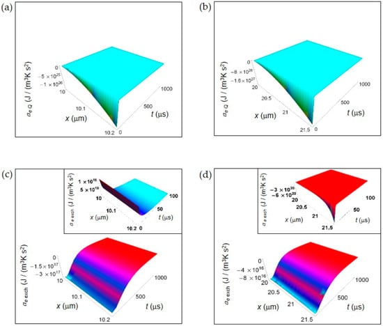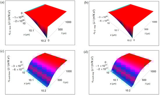 Note, however, the exceptions represented by the trends of ai Q and ai D for both kinds of cells, ae exch for a normal cell and ai r for a cancer cell during the first instants of time (interval 0–100 μs), where the entropy density accelerations are positive because of the peculiar time behavior of the terms contributing to these accelerations for small t.