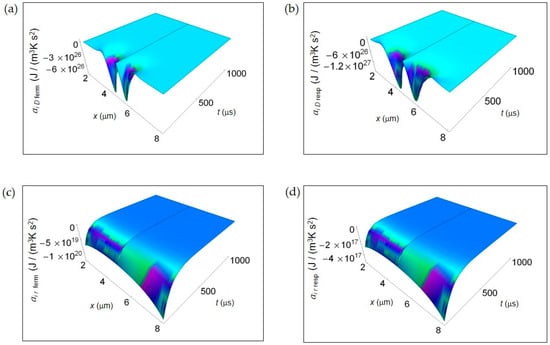 Note that in the main panels we plot all the entropy density accelerations in the time interval 100–1000 μs with the exception of ae Q. Indeed, in the first instants of time (0–100 μs), some terms of the entropy density acceleration are positive as depicted in the insets and, due to the appreciable magnitude, this would mask the leading negative trend of the accelerations in the time interval 100–1000 μs. The positive trend of most of the accelerations during the first instants of time is not surprising and is due to the initial increasing behavior of the corresponding rates. Of course, this behavior is only secondary to the leading and most important negative trend characterizing all the entropy density accelerations.