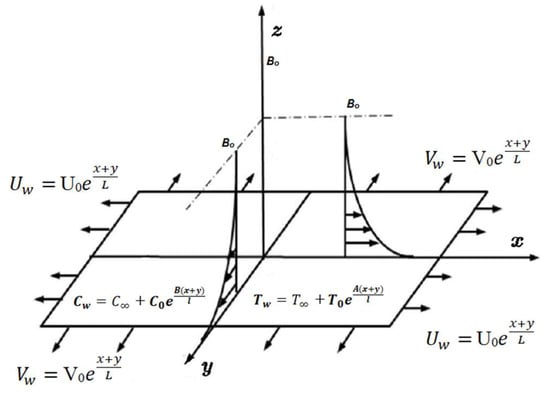 We considered the flow of MHD viscoelastic nanofluid past a permeable exponentially stretched surface with entropy generation. The analysis was performed in the attendance of nonlinear thermal radiation, chemical reaction, and heat generation and absorption with convective heat and mass boundary conditions. The magnetic field was applied parallel to the z axis. The Hall and electric field effects were overlooked. The induced magnetic field was also ignored due to our assumption of a small Reynolds number. The permeable surface was stretched in both the x and y directions with respective velocities and , as shown in Figure 1.
