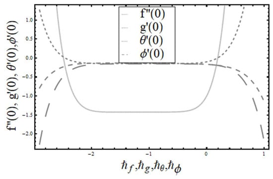 The convergence of the series solutions was adjusted and regulated with the aid of auxiliary parameters , and . For tolerable ranges, -curves were drawn and are given in Figure 2. These admissible ranges were , and , which were and These values were corroborated by the numerical values given in Table 1.