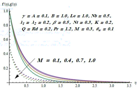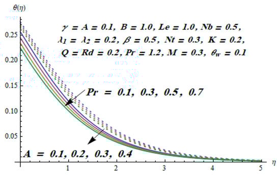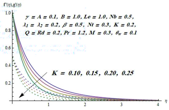 Table 2 was initiated for the rate of heat and mass transfers versus varied involved parameters. It was noticed that the Nusselt number was a growing function of and was a declining function of Similarly, the Sherwood number decreased for the values of and increased for the values of Table 3 depicts the values of both skin friction coefficients along and directions. It was gathered that both coefficients were growing functions of and Table 4 was erected to check the reliability of the presented solution by comparing it to Liu et al. [] in the limiting case. An excellent concurrence was obtained, confirming the reliability of the presented results.