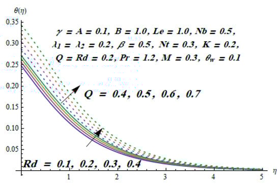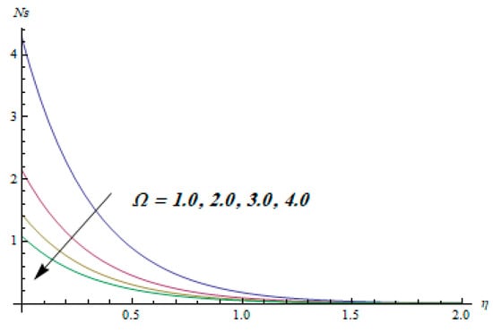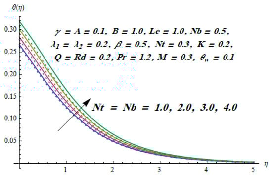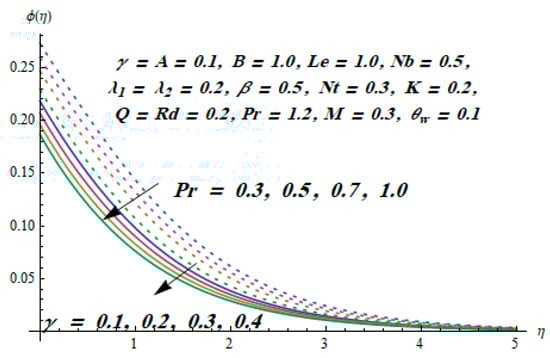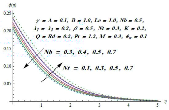 Rapid growth in the usage of nanofluids in varied engineering arenas such as cancer therapy, finer coolants in nuclear reactors and computers, numerous electronic devices in military sectors [], oil and water [,], rapid spry cooling, the food industry, vehicles and transformers, polymer extrusion, safe surgeries, quenching in foundries, and glass blowing [] have encouraged scientists and researchers to scrutinize the numerous aspects of nanofluid flow past different geometries. Nanofluids are an amalgamation of nanoparticles of size < 100 nm (i.e., metals, nitrides, carbides, and nanotubes (single or multiwalled)) and orthodox fluids such as water, toluene, engine, kerosene oil, ethylene and triethylene glycol. Nanofluids are considered to be the best coolants in all engineering applications. It was Choi [] who experimentally revealed that nanofluids possess enhanced thermal conductivity. Afterward, Buongiorno [] framed a model pointing out that the heat transfer process is triggered in the case of nanofluids due to thermophoretic diffusion and the Brownian motion of nanoparticles. Later, Khan and Pop [] discussed nanofluid flow past a stretched surface. Makinde and Aziz supported this model through convective boundary conditions over a stretched surface []. The impact of radiative nanoparticle flow with Lorentz force past a spongy semi annulus region was investigated by Sheikholeslami et al. []. Li et al. [] examined the effect of adding nanoparticles in the process of solidification of Nano-enhanced phase change material (NEPCM) in the presence of thermal radiation. The flow of water-based nanofluid containing carbon nanotubes past a permeable medium with the effects of Darcy–Forchheimer was deliberated by Muhammad et al. []. Lu et al. [] pondered on the flow of micropolar nanofluids in the presence of magnetohydrodynamic (MHD), homogeneous-heterogeneous reactions, mixed convection, and thermal radiation past a nonlinear stretched surface, numerically. The combined impacts of Arrhenius activation energy with heat and mass stratification on micropolar nanofluid flow in the presence of binary chemical reactions was studied by Ramzan et al. []. Lu et al. [] did a tremendous study considering the three-layer vertical nanofluid model following a Buongiorno scheme. Li et al. [], using Finite Element method (FEM), calculated the influence of the transportation of nanoparticles in a permeable enclosure due to electric force. Recently, some studies have discussed the applications of nanofluids in varied fields such as electrokinetic transport [], heat transfer [], and mass transfer [].