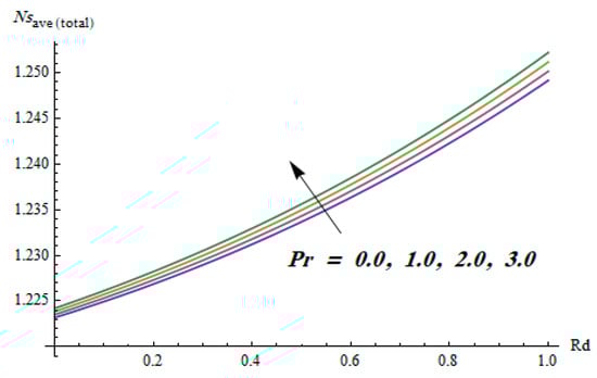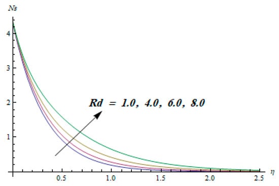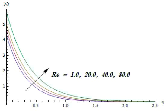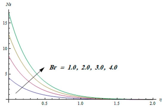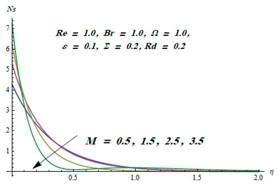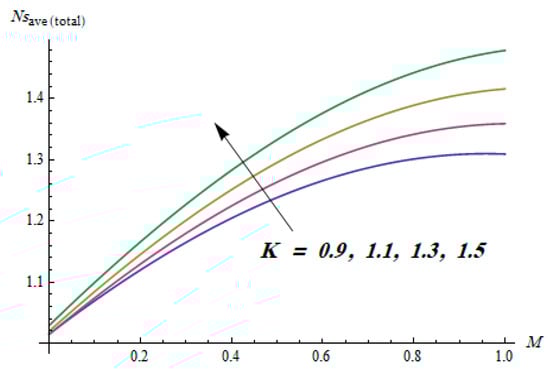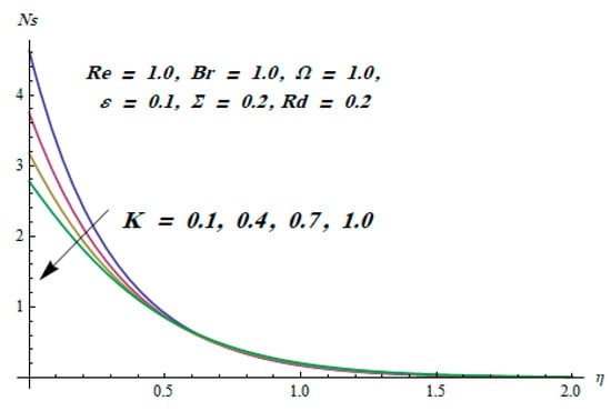 This section is dedicated to having a deep insight into changes of sundry parameters on involved profiles. The ranges of all parameters were selected via Turkyilmazoglu []. Figure 3 was drawn to show the impact of viscoelastic parameter on both velocities. Both velocity distributions were declining functions of . Augmented values of the meant the development of tensile stress, which ultimately lowered both velocity components. The impression of magnetic parameter on both velocity components is depicted in Figure 4. A diminishing behavior was witnessed for both velocity components. A strong Lorentz force was perceived due to the magnetic field, hindering the movement of the fluid flow. Thus, the reduction in velocity components was noticed. Figure 5 is outlined to grasp the impact of chemical reaction parameter and Prandtl number on the concentration field. It was visualized that the rate of mass transfer was on the decline with augmented values of Thus, the respected boundary layer was also enhanced. Smaller values of thermal diffusivity augmented the and thereby lowered the concentration distributions. The outcome of temperature exponent and Prandtl number on temperature profile can be visualized in Figure 6. The Prandtl number is the quotient of momentum to thermal diffusivity. Smaller numbers for thermal diffusivity meant higher values of , thus lowering the temperature. A similar effect was noted in the case of . Figure 7 was illustrated to depict the influence of thermophoretic parameter and Brownian motion parameter on temperature field. It was comprehended that temperature was an increasing function of both parameters. This is because smaller particles were pushed toward the colder surface from the hotter one. Another reason for this phenomenon is that enhanced random movement of the fluid’s particles also became the main source of heightening the temperature of the fluid. To understand the influence of Brownian motion parameter and thermophoresis parameter on the concentration distribution, Figure 8 was plotted. Higher values of both parameters augmented the concentration profile. Smaller particles were pulled toward the colder region due to increased values of the thermophoretic parameter, thus lowering the concentration of the fluid. Figure 9 was drawn to grasp the impact of radiation parameter and heat absorption parameter on the temperature field. In the experiment, the temperature rose with higher values of . This is because growing values of Rd meant more emission of heat that ultimately raised the temperature of the fluid. Also, the higher estimates of produced more heat that also resulted in an increase in the fluid’s temperature. The variation of magnetic parameter M for the entropy generation is presented in Figure 10. Initially, due to drag forces produced by the magnetic field, the energy was produced, which increased the entropy of the fluid. However, as it moved away from the plate, the influence of these forces reduced gradually and eventually lessened the effect of entropy as well. The effect of viscoelastic parameter on entropy generation and the Bejan number is displayed in Figure 11 and Figure 12, respectively. Both the figures clearly indicate that the enhancement of values of enhanced entropy generation as well as the Bejan number near the surface due to an increase in viscous effects. However, the opposite trend was noticed in both cases while moving away from the surface. In Figure 13, a relationship between the thermal radiation parameter and dimensionless Bejan number is portrayed. An increment in thermal radiation parameter enhanced the internal heat generation in the moving fluid, which caused the Bejan number to escalate. Figure 14, Figure 15, Figure 16 and Figure 17 were illustrated to show the impacts of dimensionless temperature difference Ω, Reynolds number Re, thermal radiation parameter Rd, and Brinkman number Br on the variation of local entropy generation number Ns, respectively. From Figure 14, it is revealed that as the temperature difference increased, a decrease in the entropy generation parameter was noticed. Larger values of Ω did not affect the viscous part of the entropy generation. However, only the thermal entropy generation segment was responsible for higher temperature gradients in the transverse direction. In Figure 15, Figure 16 and Figure 17, Ns was an increasing function of these three: Re, Rd, and Br. Figure 18 and Figure 19 were drawn to depict the influence of M, K, Pr, and Rd on average entropy Ns(avg). From these figures, it was gathered that Ns(avg) was an escalating function of all four parameters. This meant irreversibility mounted as the group parameters grew.