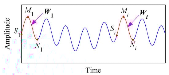 Assume the original signal is x(t), Mi and Ni (i = 1, 2, 3,…) are the maximum and minimum points of x(t), respectively. and correspond to the time of the maximum and minimum points, respectively. The left end of the signal is defined as S1. The signal shown in Figure 1 was taken as an example, the first extreme point of which is a maximum point. The waveform S1-M1-N1 is targeted as the characteristic waveform W1. Then the optimal matching waveform will be searched within the whole data. Finally, the left data of the optimal matching waveform will be extended to the left of the data. The specific steps are given as follows: