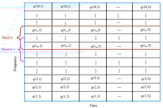 Figure 2 shows the division result of the TFS plane corresponding to the CFBEE method. For the kth characteristic frequency band (), and represent its start and end row. Supposing the energy of the time–frequency block in the kth characteristic frequency band is W(i,j) and Wk is the total energy of the kth characteristic frequency band. The normalized energy of any time–frequency block can be described as follows: