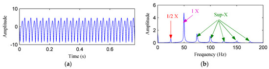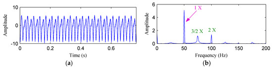 Figure 5a,b shows the waveform and frequency spectrum of the simulated rubbing signal in the Y direction, respectively. As can be seen from Figure 5b, the fundamental frequency, fractional harmonics and high harmonics are all clearly presented.