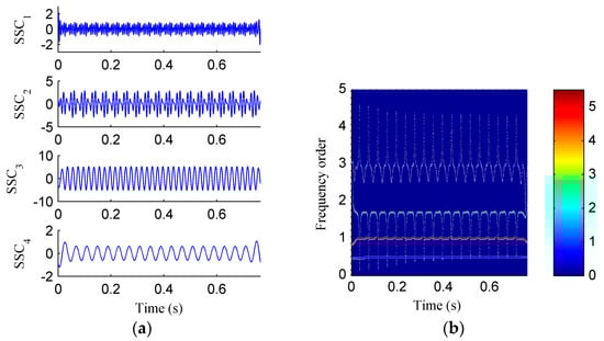 Then, the simulation signal is processed by EMD, SSD and ISSD respectively, and the results are shown in Figure 6, Figure 7 and Figure 8, respectively. Figure 6a displays the decomposed sub-components using EMD and Figure 6b depicts the corresponding HHT TFS, i.e., the EMD-HT TFS. To clearly reveal the relationship between the frequency components exhibited in the TFS and the rotation frequency, the y-axis of the TFS in this paper was described using the frequency order, which is defined as the ratio of the actual frequency to the rotation frequency. Six sub-components were extracted after the EMD decomposition, but some of them are false components without physical meaning. The model aliasing problem appeared on the HHT TFS, which makes the HTT TFS cannot accurately reflect the fault information. As shown in Figure 7a, four sub-components were derived after the SSD decomposition. The corresponding SSD-HT TFS as depicted in Figure 7b reflects the characteristic frequencies of the simulated rubbing fault. Moreover, the “intrawave frequency modulation” phenomenon which is one of the characteristics of rubbing fault as reported in [35] was clearly extracted. However, the end effects can also be found from the SSD-HT TFS. The appearance of the end effect can cause the change of the energy–frequency–time distribution in the TFS to some extent. Consequently, the energy–frequency–time distribution of the TFS will lose its real regularity. To ensure a more accurate measure of the energy distribution characteristics of the TFS by using the CFBEE index, the end effect problem should be solved. Compared with Figure 7a, the sub-components obtained by using ISSD as shown in Figure 8a overcome the end effects. The corresponding ISSD-HT TFS displayed in Figure 8b is also away from the end effects. Hence, the superiority of ISSD method over the other two methods can be demonstrated from the simulated results.