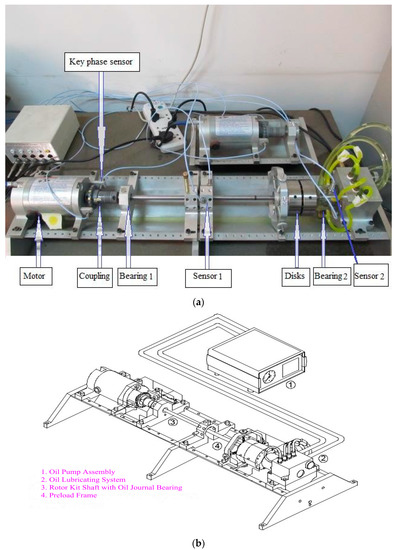 The experiments were carried out on a Bently RK-4 rotor test bed as displayed in Figure 13a,b shows the structure diagram of the test bed. As can be seen from Figure 13, the test stand is an oil-fluid supporting rotor bearing system, which is mainly built with a motor, a shaft, two discs, several mounting blocks for probe and rub screw, two bearings and a speed regulating device. The test bed can be adopted for simulating some common rotor faults such as rubbing, imbalance and oil film instability failures (see Hu et al. [35] and Wang et al. [36]). During the experiments, a key phase senor was arranged near the rotating shaft to acquire the rotation speed information. Two sets of eddy current sensors which were installed on two mounting blocks were employed to collect the vibration signals of the shaft.