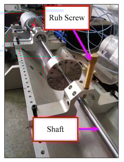 To verify the validity of the proposed method, four kinds of rotor fault types, which include normal state, rubbing, oil film whirl and imbalance fault were simulated using the experimental rig. Specifically speaking, a single disk was installed on the shaft for the normal, rubbing and imbalance rotor states simulation. Two bearings were symmetrically arranged on both sides of the disk. The first-order critical speed of the experimental rig is about 1890 rpm. As the working speed of many practical machines, such as the steam turbine, is above the first-order critical speed, the rotation speed of the normal state in this paper was set as 3000 rpm and the test rig was not subjected to any abnormal forces. Since the local rubbing fault is more common than the full rubbing fault, the rotor/stator local rubbing was simulated in the experiment. Figure 14 displays the schematic diagram of rubbing. A rub screw installed on a mounting block was adjusted to touch the shaft to simulate the rub process. The rotation speed for the rubbing sate simulation was kept as 1760 rpm. The rotor imbalance state was simulated by installing counterweight bolts on the disc. The counterweight is 1 g and the rotation speed of the imbalance was set as 1500 rpm. The occurrence of oil film whirl needs to satisfy two conditions: (1) the rotation speed is above a certain speed, which is usually the first-order critical speed; (2) the oil film force is instable. When simulating the oil film whirl state, the following equipment, i.e., oil pump assembly, oil lubricating system, rotor kit shaft with oil journal bearing and preload frame, were required to achieve the instable oil film force. The way this equipment was linked is shown in Figure 13b. Two disks were installed on the shaft for simulating the oil film whirl fault. The rotation speed increased from zero by adjusting the motor and light oil film whirl began to appear at the speed of 1800 rpm. The oil film whirl signal at the speed of 3000 rpm was collected for analysis. The corresponding rotation frequency of the normal, rubbing, oil film whirl and imbalance states can be calculated to 50 Hz, 29.33 Hz, 50 Hz and 25 Hz, respectively. The sampling frequency is 1280 Hz. To evaluate the classification accuracy of the proposed method, the vibration signal of each fault type was dived into 40 samples and the sampling number of each sample is 2048. Among the 40 samples of each rotor state, the former 20 samples were selected as the training sample sets and the other 20 samples were employed as the test sample sets.