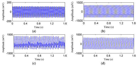 The waveforms of the signal of (a) Normal state; (b) rubbing state; (c) oil film whirl state; (d) imbalance state.