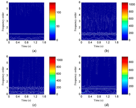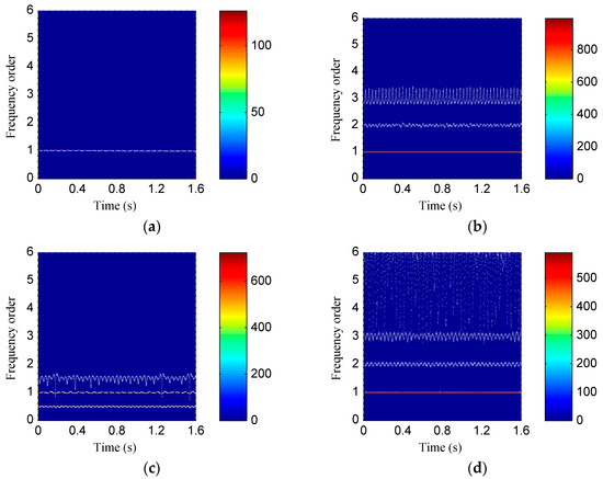 The ISSD-HT time–frequency spectrum of (a) Normal state; (b) rubbing state; (c) oil film whirl state; (d) imbalance state.