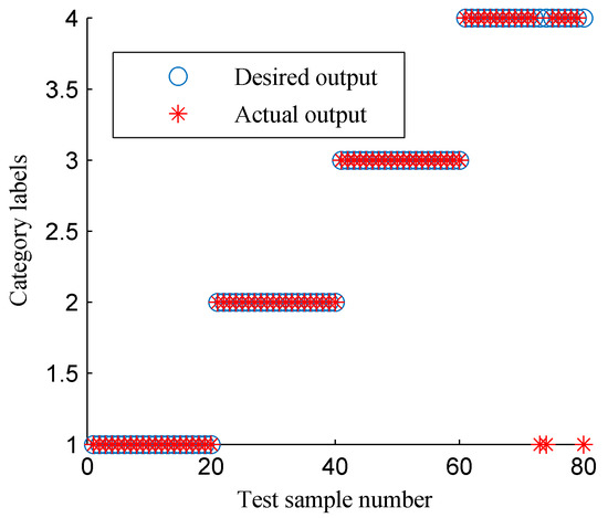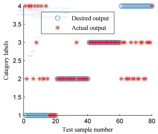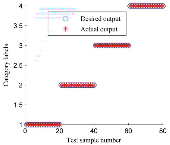 Then, the proposed approach was employed to realize the intelligent fault diagnosis of rotor faults. First, the CFBEE of the ISSD-HT TFS of the four simulated states was calculated by using the calculation method introduced above. Figure 18 shows the cure of the CFBEE (each state includes 40 samples). It is obvious that the tendency of feature distribution for a specific rotor state is almost the same, and different rotor states have different trends. Thus, the state of the rotor can be characterized effectively by using the CFBEE index. To diagnose the state of the rotor automatically, SVM was adopted. The calculated CFBEE as the fault feature vectors were input to SVM for training and classifying. The classification results of the test sample sets obtained using SVM is shown in Figure 19. The category label 1, 2, 3 and 4 respect the normal state, rubbing state, oil film whirl state and imbalance state, respectively. The state diagnosis accuracy of the proposed method is 100%. This indicates the proposed approach is very effective for identifying rotor faults.