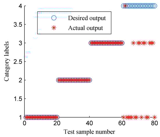 Figure 22 and Figure 23 display the classification results of SVM by using the EMD-based TFE and ISSD-based TFE methods, respectively. For the classification results shown in Figure 22, 28 samples of four rotor states are misidentified, so the identification accuracy of the EMD-based TFE method is only 56.25%. Three samples were mistakenly by using the ISSD-based TFE method as Figure 23 shows, therefore the identification accuracy of the ISSD-based TFE method is only 96.25%. The contrast analysis results show that the CFBEE index can more accurately evaluate the characteristic information of the TFS compared the TFE index.