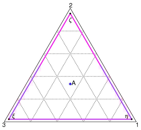 In our simulations we chose , since that was the value for the Margules parameter in the triphase separation simulation of an ideally perfectly symmetric ternary mixture reported by Park et al. [2]. In fact, for the phase diagram for the mixture is a tie triangle [1], whose vertices represent the compositions of three coexisting phases (see Figure 1) at local equilibrium. If we let , , and , the coordinates for the vertices are readily found by observing that all (thermodynamic) chemical potential differences reduce to either a trivial identity or the following relation