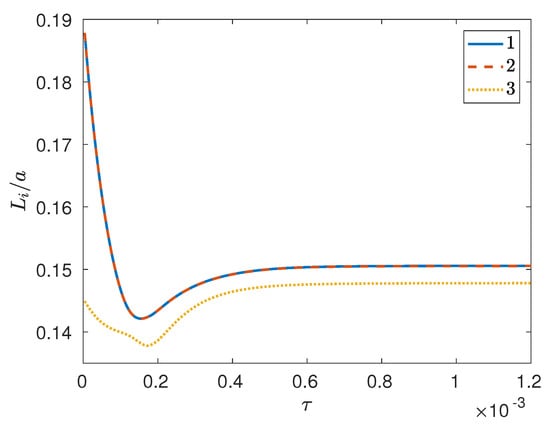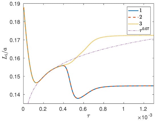 In another simulation (denoted as case II below), the initial conditions were generated such that the random noise for component 2 exactly canceled that for 1 at the initial time; this necessarily implies , along with . In this case (see Figure 5), phase separation for component 3 is slower than that for the remaining two components, given that the separation depth for component 3 remains smaller (and in fact close to zero) than that for 1 and 2 for some time after the initial time, after which all separation depths show a very rapid increase to their steady state values. Once again, even though and remain identical for all time, the steady state value for 3 turns out to be slightly larger than that for the first two components. Also note that in this simulation the temporal evolution of the integral scales is very different from that corresponding to case I; in fact, even though the integral scales for 1 and 2 are essentially identical for all time (see Figure 6), the integral scale for 3 is systematically smaller than that for 1 (or 2) while showing a similar decrease–increase behavior. Once again, this temporal evolution seems to be robust, in that very similar temporal histories are also displayed by the reciprocal first and second moments of the structure factor.