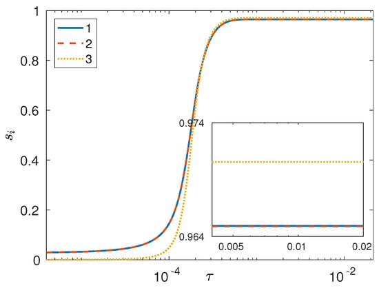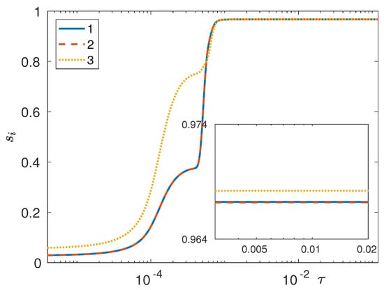 with and denoting the molecular mass and kinematic viscosity of each pure component, while D denotes the (same) binary diffusivity for all component pairs. This dimensionless group can be introduced as an inverse capillary number [43], while it can also be interpreted as a Peclet number [33,34,38,39,40,41], i.e., the ratio of convective to diffusive mass fluxes in the species balance equations. In fact, in previous works [33,34,44,45,46,47,48,49], we have noted that, in low-viscosity systems, is usually of order , while highly viscous mixtures (e.g., polymer melts and alloys) correspond to a vanishing fluidity coefficient. In the latter case (which is the focus of the work reported herein), the diffuse-interface model describes a diffusive (or antidiffusive) separation process in the absence of flow, and the species balance equations assume the particularly simple form seen earlier [26,30]: