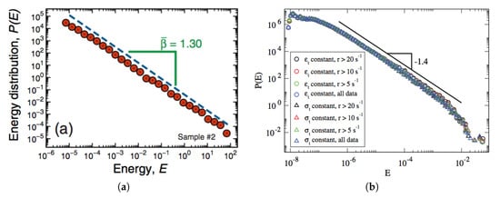 Typical energy power-law distributions found in experiments. (a) Energy distribution versus E, obtained from the cracking noise produced by charcoal samples, when dampened with ethanol (from Reference [35]). (b) Energy distribution versus E, obtained from acoustic emission in small wood samples under compression. Data from different experimental conditions, i.e., constant strain rate , constant stress rate , and various event rates (defined as the number of events in a time interval divided by the interval length), all fall in a universal probability distribution (from Reference [33]). In both cases, the variable E is properly normalized and defined as a dimensionless quantity; within the present approach (cf. Equation (10)), these examples correspond to (case (a)) and (case (b)).