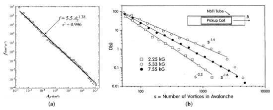 Let us now analyze systems characterized by a given parameter x and its associated power-law distribution ; contrary to the examples shown in Figure 1, the relation between x and does not follow straightforwardly; two typical examples in this class are shown in Figure 2. In Figure 2a the forest-fire frequency density per year is represented versus forest burned area . The straight line yields a frequency versus area power-law distribution with an exponent ; the data corresponds to Ontario, Canada, during the period 1976–1996 [36]. Results from experiments carried out on a NbTi (conventional superconductor) sample, at the Bean critical state, are exhibited in Figure 2b [37]. For hard superconductors, the Bean critical state corresponds to a marginal stable state, where the Lorentz force acting on each vortex equals the maximum pinning force. A sketch of the experimental arrangement is represented in the inset, where one has a tubular NbTi sample and the pickup coil. An external magnetic field enters the interior of the tube, inducing a voltage on the pickup coil; large variations of the voltage in the pickup coil are associated with avalanches. The corresponding probability density for measuring an avalanche of s vortices is represented versus s (cf. Figure 2b), for three different values of the magnetic field (the exponent of the power-law distribution is field-dependent); one notices that for the higher value of the magnetic field (7.55 kG), one gets avalanches up to 5000 vortices. In both examples shown in Figure 2, one expects the variable of the previous section to be an increasing function of the relevant variable, i.e., of the burned area (Figure 2a), as well as of the energy required for producing s vortices in a given avalanche (Figure 2b).