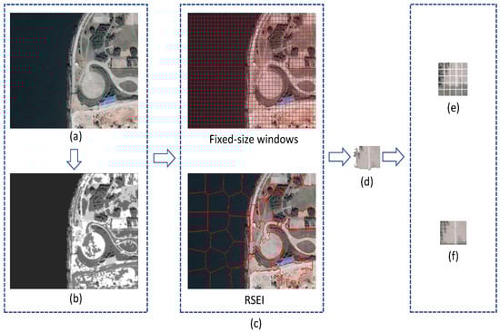 Differences between RSEI and the fixed-size sliding window. (a) Reference image. (b) Saliency map of the reference image. (c) Segmentation results. (d) Image patch in the upper-right corner of semantic segmentation map. (e) Completely overlay the image patch (d) by fixed-size windows. (f) Completely overlay the image patch (d) by RSEI.
