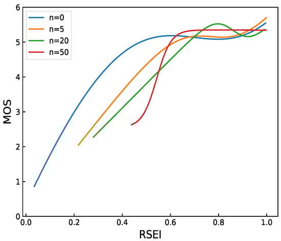 The number of image patches is an important parameter used in RSEI. The first six reference images are selected from the TID2008 [] reference image and the corresponding 408 distorted images for parameter tuning. We set n at 0, 5, 20, and 50 and then perform RSEI evaluation. The curve fitting results are shown in Figure 4. The patch is inaccurate when n is 0 and 5. RSEI cannot accurately evaluate all images with high MOS, and performance is not constantly improved with the increase of n. The image patch increases when n is 50, which leads to the low recognition degree of RSEI for MOS greater than 5 and high time complexity. Thus, we set n to 20.