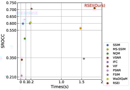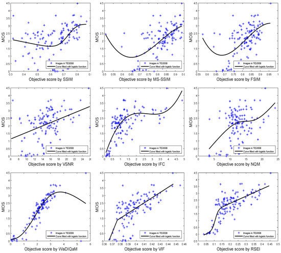 The curve fitting to MOS and image objective scoring is shown in Figure 5. All the scores of the IQA metrics are listed in Table 2. RSEI obtains the best objective score for SROCC, PLCC, and RMSE, and the next best score for KROCC. For the abovementioned distortion types, the performance of RSEI correlates more consistently with the subjective evaluations than do the other methods.