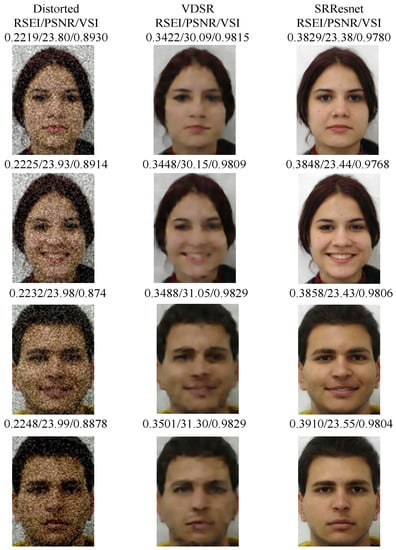 The FEI faces database [] includes 400 images of 200 people (100 men and 100 women). Each person has two frontally aligned face images, where the first one is a frontal facial image and second one is a smiling image. The image size is pixels. Figure 7 shows several denoising results on the FEI face dataset [] in which the images are added with different levels of Gaussian noise. is the standard deviation of the added noise to the images. The first column is the distorted image used as the input noise image with . The last two columns are the denoising results of VDSR [] and SRResnet [], respectively. Clearly, SRResnet has a stronger denoising effect, the results also show more fluent details and color deviations.