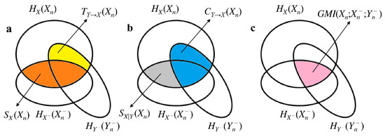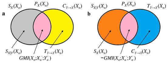 holds as well (Figure 1b,c), equivalently measures the influence of the past of X on the information sharing between Xn and . when , namely when the knowledge of the past of X is useless in explaining the dependency of X on . when , namely when the cross-information from Y to X completely explained by . Positive indicates that past of X inhibits the cross-information from Y to X because it accounts for, or explains part of, the dependency of X on . Thereby, we deduce that the past of X contributes redundantly to the information sharing between X and . When ,