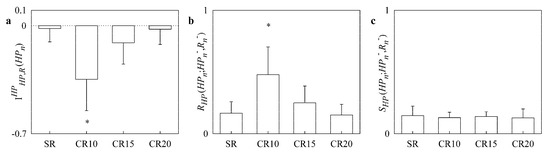 The simple bar graphs in Figure 3 show (Figure 3a) (Figure 3b) and (Figure 3c) as a function of the experimental condition (i.e., SR, CR10, CR15 and CR20). During CR10 significantly decreased below 0 (Figure 3a), while significantly increased (Figure 3b). Paced breathing protocol did not affect (Figure 3c).