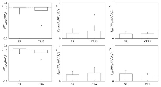 The simple bar graphs show , and in CHF patients during paced breathing (a,b,c) as a function of the experimental condition (i.e., SR and CR15), and during slow breathing (d,e,f) as a function of the experimental condition (i.e., SR and CR6). Values are reported as mean plus standard deviation. The symbol * indicates a significant difference versus SR with p < 0.05.