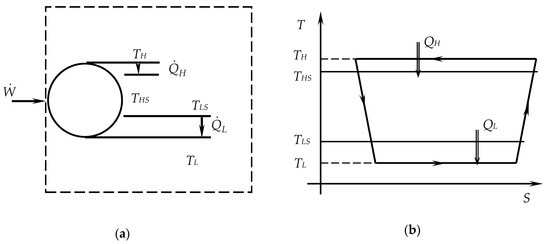 As shown in Figure 1, the two heat reservoirs are thermostats, of constant temperatures THS and TLS, the first one being actually the environment. The refrigeration machine is considered operating in steady state regime.