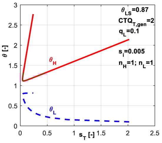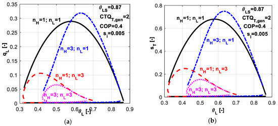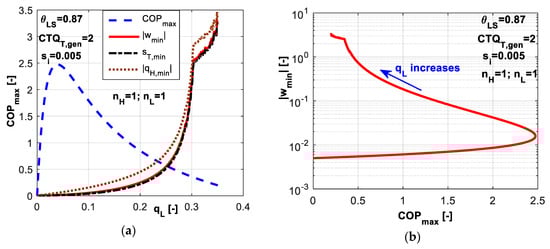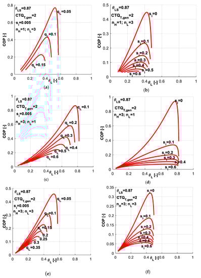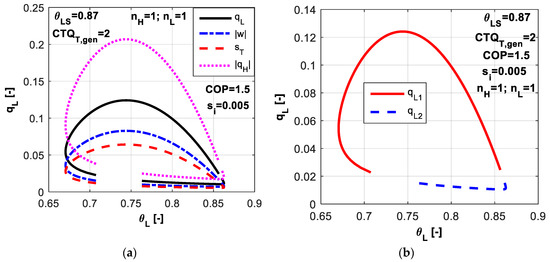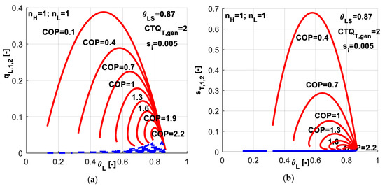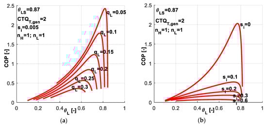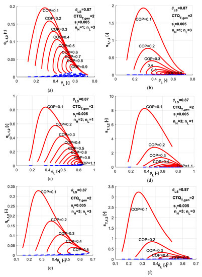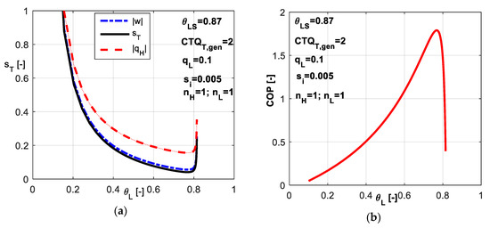 As COP and θSL are imposed for the system operation, the optimum for q̃L will lead to optimum for s̃T in the same time. More specific, maximum of q̃L will lead to minimum of s̃T, since the minimum of entropy production is directly correlated to minimum of consumed power, which at its turn is linked by Equation (13) to maximum of q̃L for imposed COP.