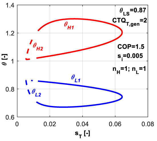 The objective function FO in Equation (21) is either the COP, or the non-dimensional entropy production s̃T. The Lagrangian is computed and a similar system of equations as Equations (35) or (44) is obtained and solved with respect to the same variables CTQL,gen, θH, θL: