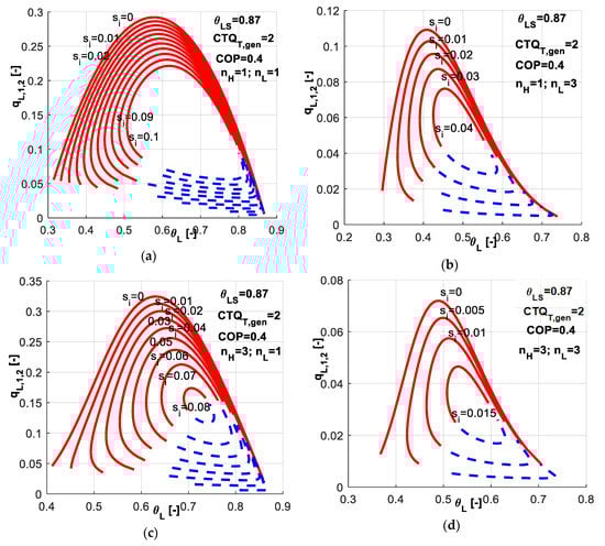 Figure 15 presents a sensitivity study with respect to q̃L and s̃i values associated to different combinations of heat transfer laws. This study is similar to the one presented in Figure 8 when imposing COP instead of q̃L. One might notice that the different considered combinations of exponents nH and nL lead to different possible ranges for q̃L as a constraint and for θL as control variable. Maintaining the same settings for the machine in all cases (CTQT,gen = 2, θLS = 0.87, s̃i = 0.005), one observes that:
