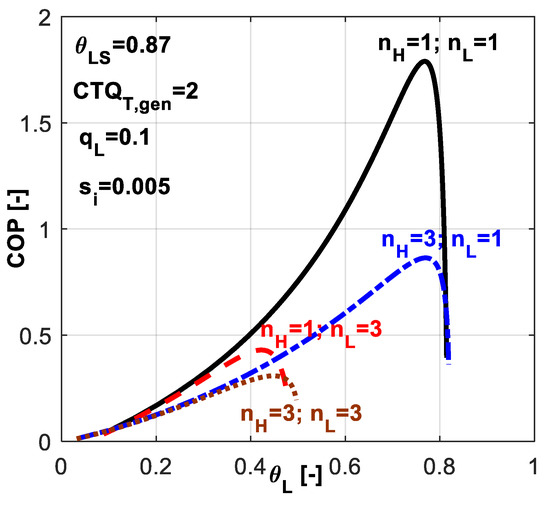 One might notice that for this application, the best alternative is to choose a linear heat transfer law at the sink and a phase change process at the hot source (nH = 3, nL = 1). This combination leads to maximum COP for a required cold temperature and also it allows the system operation over a wider range of θL values. From Figure 15c one may also notice that this combination ensures the system operation at heavier refrigerating loads.