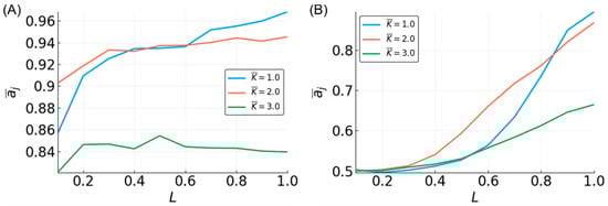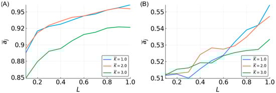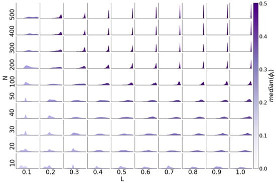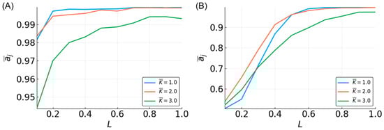 For each combination of  and , we have a distribution of  values, one for each of 100 BN RCs. These can be visualized as density curves (Figure 8). With increasing values of  and , the distributions become increasingly right skewed and sharply peaked; meanwhile, low ,  values are characterized mostly by reservoirs with low  values, and high ,  values are characterized mostly by reservoirs with high  values. However, for many intermediary values of  and , there is a rather flat distribution of  values, indicating that there is heterogeneity of flexibility in the performance for reservoirs with these parameters (i.e., some are highly flexible, while some are not). The gradation of distribution shape with increasing  and  values depends on the value of  (Figure S4A,B), although the overall trend remains. With higher values of , the distribution only shifts toward higher accuracies with higher values of , .